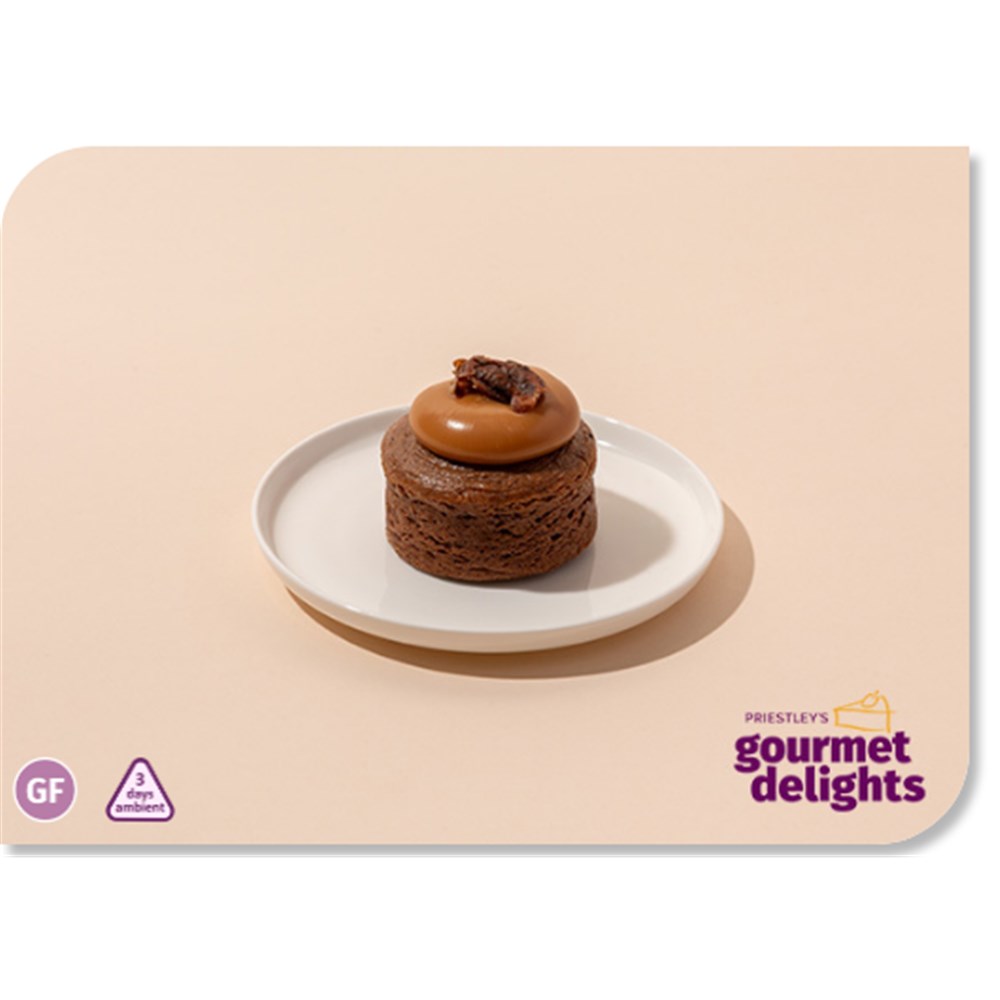 A golden gluten free sticky date cake topped with a generous dollop of salted caramel and garnished with a pitted date. Warm up to create the perfect self-saucing indulgence.